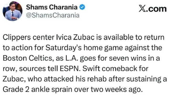 爆料王Shams:祖巴茨将在本周日快船主场VS凯尔特人比赛中复出。
