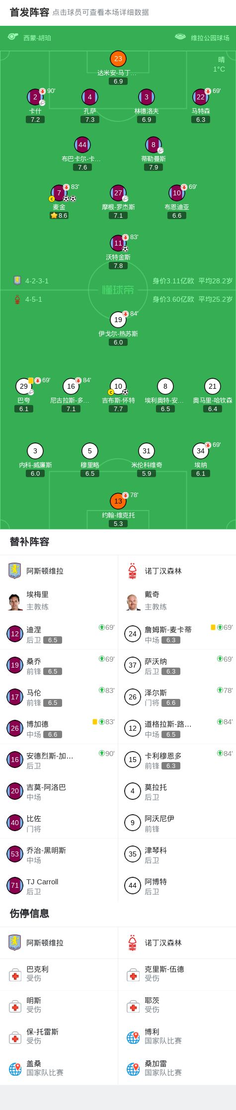 维拉3-1森林,麦金双响,沃特金斯世界波,维克托送礼后伤退