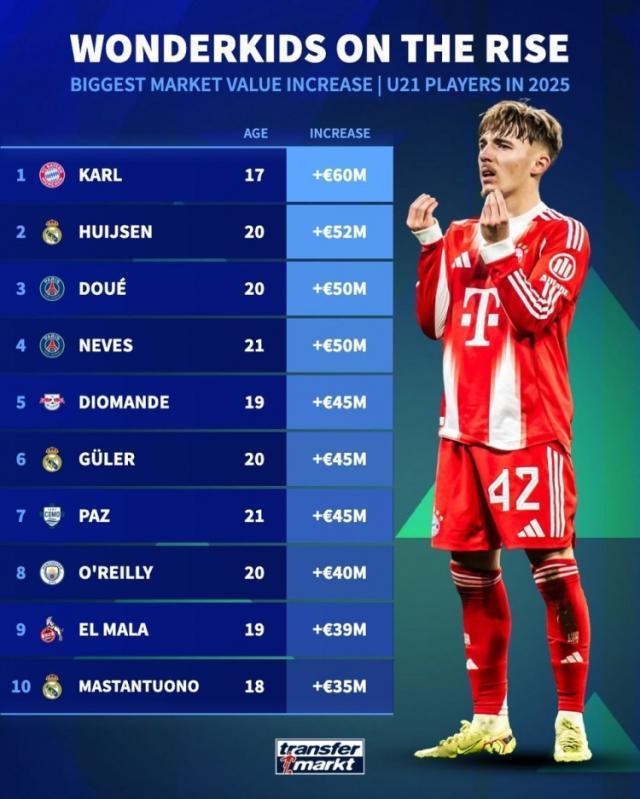 《转会市场》统计了2025年U21球员的身价上涨幅度情况,拜仁小将卡尔位居榜首。德转列U21年度身价上涨榜:欧元