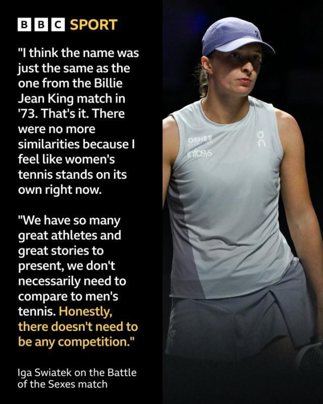 近日在迪拜举行的网球性别大战中,女单世界第一萨巴伦卡3比6、3比6不敌现男单世界排名第671位的前温网男单亚军克耶高斯。对此现女单排名世界第2的斯瓦泰克给出了自己的看法,她表示:“不,我没看过,因为我不看这类东西。那是娱乐节目,但我认为它与社会变革或任何重要议题都无关。我想它的名字只是和1973年比利·简·金的比赛一样罢了,仅此而已,没有更多相似之处。因为我认为女子网球现在本身就足够出色。我们有这么多伟大的运动员和精彩的故事可以呈现,没必要和男子网球作比较,那是完全不同的历史。