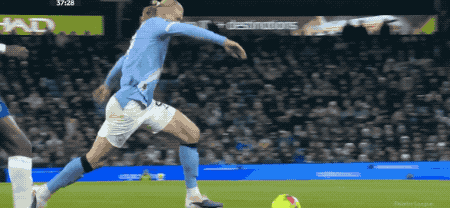 第42分钟,谢尔基准备直塞给哈兰德,皮球被巴迪亚希勒拦截后到了赖因德斯的脚下,赖因德斯连续假动作闪出角度,爆射死角,曼城取得领先。